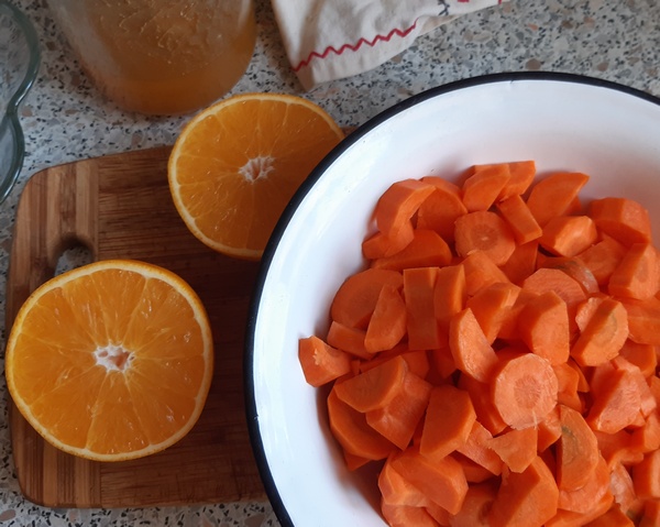 Pokrajać oskrobane marchewki i skórkę z pomarańczy i cytryny. Zagotować lekki syrop z cukru i wody, włożyć marchewkę i skórki i gotować powoli do miękkości.