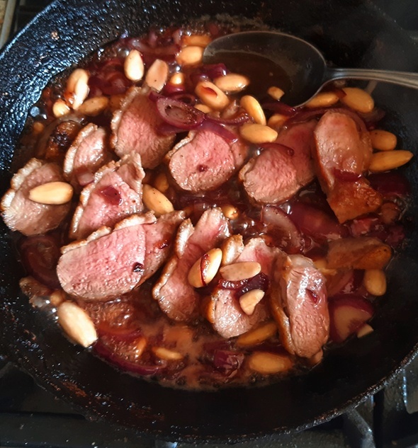 Zamiast migdałów można wziąć dowolne orzechy. Ta część kaczki nie powinna być duszona za długo, aby nie stwardniała. Może być podana na ciepło, świeżo przyrządzona, albo podana na zimno, przygotowana wcześniej. Zawsze smakuje fantastycznie.