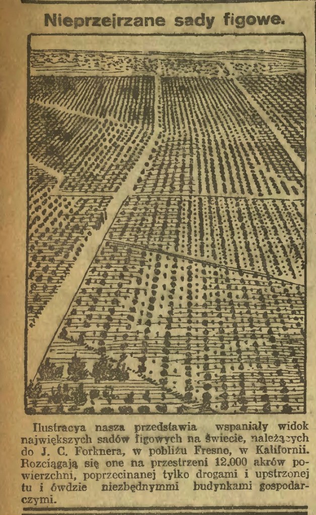 A deser? Deser też będzie. Kupmy do jego sporządzenia figi. Teraz jest na nie dobry czas. Nie bójmy się tych wciąż u nas mało znanych owoców. Obawa jest tylko o to, że się w nich zakochamy. A nie są tanie. Przypatrzmy się, jak wyglądała ich uprawa przed wojną w Kalifornii. Rycina (jeszcze nie zdjęcie) z „Ilustrowanego Kuryera Codziennego” z roku 1924.
