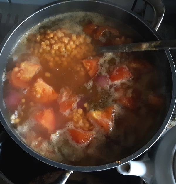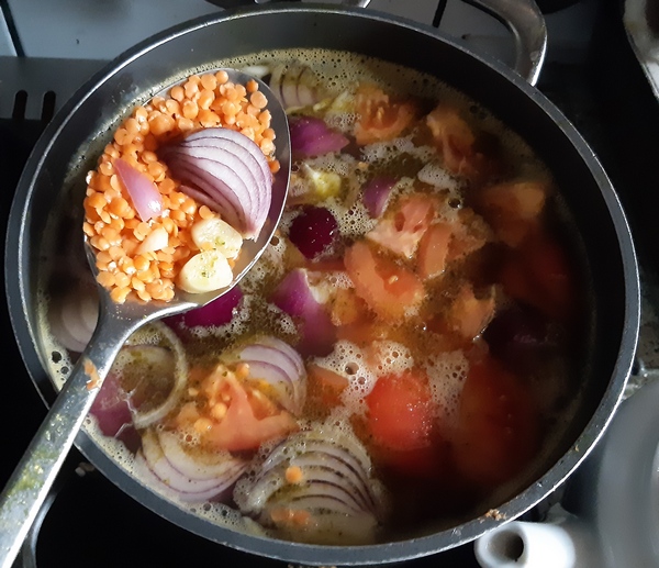 Do garnka z bulionem (1,5 l) wsypać soczewicę, dodać pokrojone cebule i pomidory (lepiej bez skórki).
