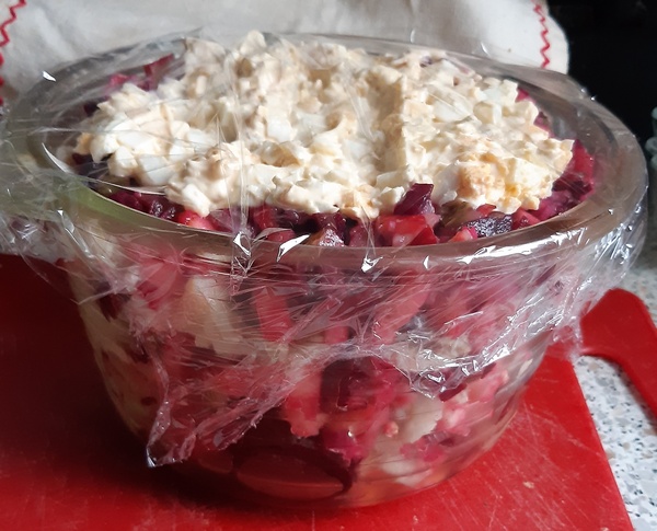 Z posiekanych jajek na twardo oraz majonezu przyrządzić „kołderkę”. Sałatkę przykryć tą kołderką. Do czasu podania trzymać sałatkę w lodówce, przykrytą folią spożywczą.