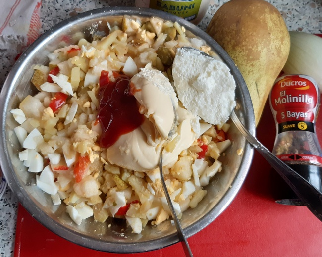 Ziemniaki i owoce pokroić w kostkę. Dodać pokrojone w kosteczkę dwa jajka (dwa pokroić w ćwiartki). Z podanych składników przyrządzić sos majonezowy) majonez jogurtem po połowie, ketchupu 1–2 łyżki). Wmieszać w sałatkę. Na wierzchu rozłożyć ćwiartki jajek. Posypać je solą i pieprzem.
