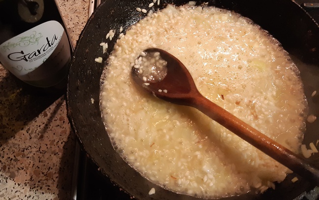Na patelni z grubym dnem (do duszenia) rozgrzać łyżkę oliwy a po chwili roztopić w niej łyżkę masła i wrzucić drobno pokrojoną cebulę. Poddusić przez ok. 3 minuty do zeszklenia (nie powinna się rumienić). Dorzucić ryż. Mieszając trzymać, aż każde ziarenko pokryje się tłuszczem i zeszkli.