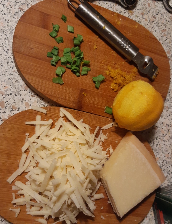 Ryż zalać winem, dusić, aż wino odparuje. Po trochu wlewać tyle bulionu, aby ryż był nim pokryty. Powolne duszenie potrwa ok. 20 minut. Ryż ma być miękki. W tym czasie obrać melona, wyjąc z niego ziarenka, miąższ pokroić w kostkę. Zetrzeć ser na grubszej tarce, pokroić szczypiorek.