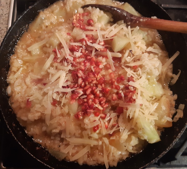 Oczywiście, te pestki granatu możemy sobie darować. Ale z nimi smakuje ciekawiej i wygląda pięknie. Do tego risotta podajmy schłodzone białe wino, to, którego użyliśmy do jego gotowania.