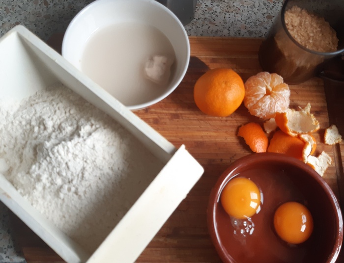Drożdże zalać letnią wodą lub mlekiem. Zostawić na 15 minut. Gdy zaczną rosnąć, wlać je do masy jajeczno-mandarynkowej, dodać mąkę, wanilię i szczyptę soli, wyrobić na gładkie ciasto.