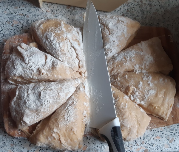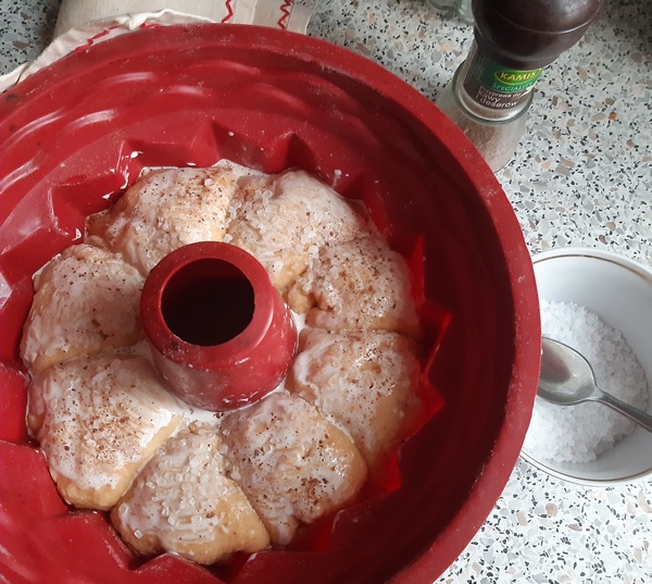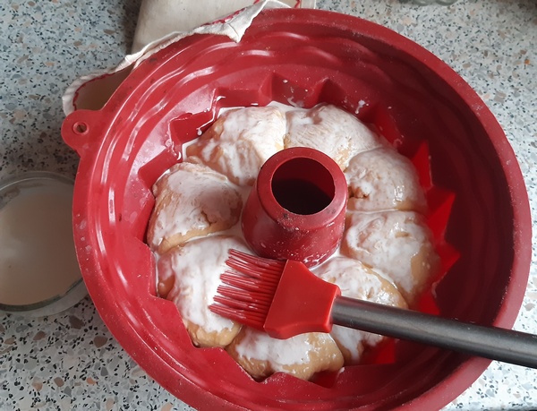 Kulę ciasta podzielić na osiem cząstek. Ułożyć w foremce na babkę z kominkiem (jeśli jest blaszana, wysmarować ją masłem). Zostawić ponownie do wyrośnięcia przez 30 minut.