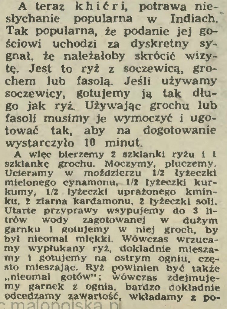 Na zakończenie wrócę jeszcze do zwykle u nas niedocenianej soczewicy. W roku 1986 w „Przekroju” Oskar Sobański podał kilka przepisów z pisanej wtedy przez siebie, we współautorstwie z Janiną Pałęcką, książki o kuchni indyjskiej. Ukazać się miała dwa lata później pt. „Kari na bananowym liściu”. Potrawy z soczewicy są mocnym filarem tej kuchni. Oto jedna z nich. Interesująca!