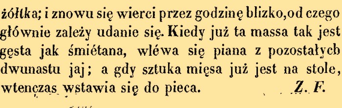 [Z soczewicy] po zagotowaniu jednorazowem odlać wodę, przepłukać, nalać świeżą ciepłą i na wolnym ogniu gotować. Gdy miękka posolić, wziąć na 4 osoby, czyli na pół kwarty soczewicy łyżkę masła zagotować z pół łyżką mąki, dolać octu, rozebrać smakiem z soczewicy, wlać łyżkę cukru palonego, czyli karmelu, wymięszać sos z soczewicą i podać na stół, okładając smarzonemi [tak!] sosistkami [to małe kiełbaski] lub plasterkami gorącej wędzonki, którą można w soczewicy ugotować. Można także gotować ją na świeżej wieprzowinie, lub tylko na ogonie wieprzowym, kładąc go naturalnie w soczewicę, po odebraniu i nalaniu świeżą wodą.