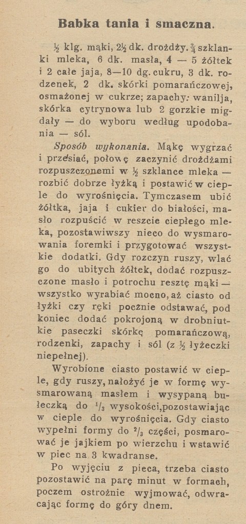 Drugą babkę, już ja należy, drożdżową, opisał tygodnik „Prosta Droga”, organ Związku Pracy Obywatelskiej Kobiet, w roku 1937.