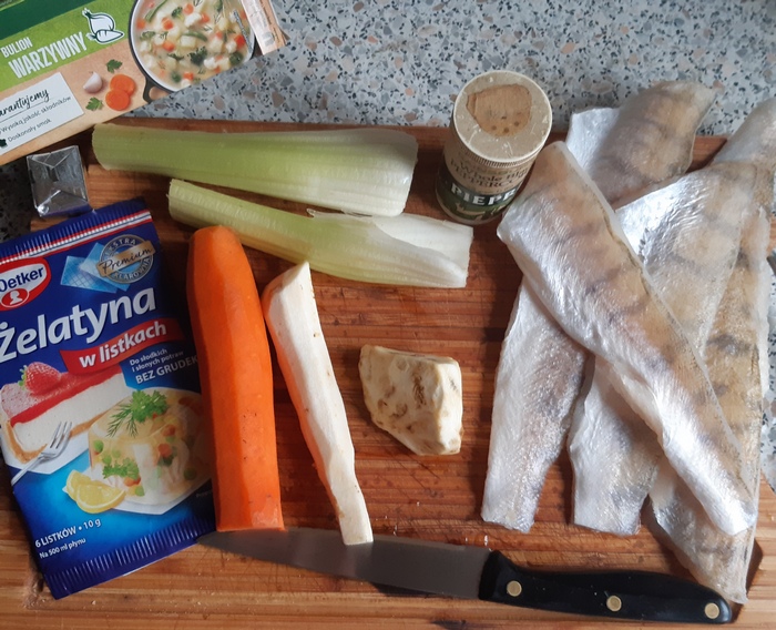 W tym czasie ugotować jajka na półmiękko lub na twardo (do szybkiego podania te pierwsze). Obrać ze skorupek, przekroić na pół. Żelatynę namoczyć w zimnej wodzie (zgodnie z przepisem na opakowaniu). Przed użyciem odcisnąć z wody. Ostrożnie wyjąć filety, ułożyć na półmisku, wyjąć warzywa, pokroić.