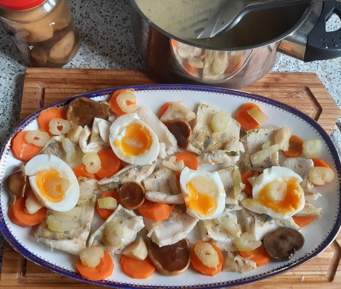 Między filetami z sandacza rozłożyć pokrojone warzywa, połówki jaj, marynowane grzyby (większe przekroić). Wywar z ryby odcedzić, w gorącym starannie rozmieszać żelatynę. Chochlą zalewać wywarem półmisek z sandaczem. Odstawić, aby się galareta ścięła. Potem, pod folia, trzymać w lodówce.