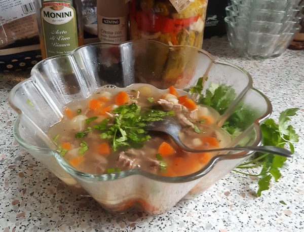 Kolejną potrawę w galarecie, która także może królować zimnemu bufetowi, przyrządziłam z… resztek. Tak, tak, były do resztki pieczonej gęsi. Tak samo można wykorzystać pozostałości po każdym, innym drobiu: pieczonym lub gotowanym, byle nie był w sosie. Resztki z kurczaka, kaczki, indyka będą także pięknie wyglądać i dobrze smakować.