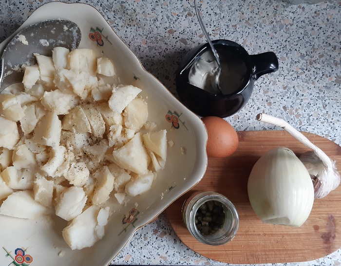 W naczyniu do zapiekania wymieszać ziemniaki z cebulą i kaparami. Posolić, popieprzyć.