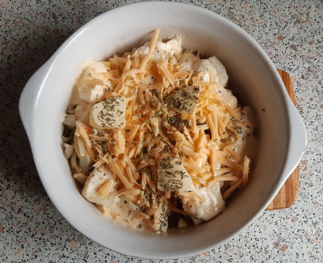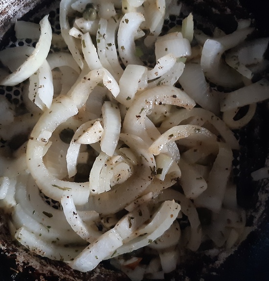 Naczynie do zapiekania wysmarować masłem. Ziemniaki pokroić w kostkę. Kapary odcedzić z zalewy. Cebulę pokroić w półplasterki, zeszklić w maśle z solą, i pieprzem.