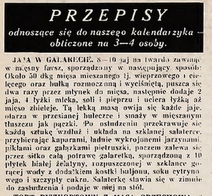 Z kolei klasyczne nóżki w galarecie – potrawa zapomniana ze szczętem, kiedyś podawana w każdym domu! – opisało w roku 1937 pismo dla pań „Prosta Droga”.