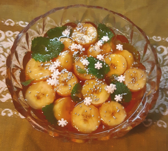 A galarecie można podać prawie każde owoce (uwaga, przy surowych kiwi i ananasach galaretka się nie zetnie!). Wyżej pokazałam banany w galarecie, takiej kupnej, z torebki. Sięgam po nie od czasu do czasu zalewając nimi owoce surowe lub obgotowane. Można je podać same, z bitą śmietaną lub kulką lodów. Nawet zimą. To świetny czas na podawanie galaret.