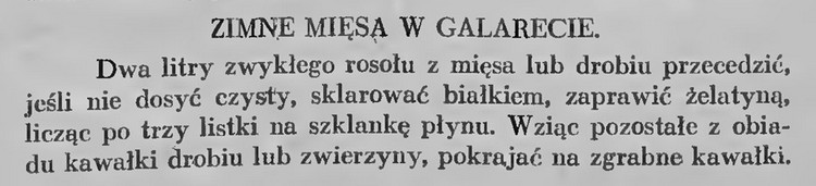 Bierze się nóżek cielęcych 6, lub 4 wołowych, oczyszcza jak najdokładniej i nastawia w zimnej wodzie. Gdy się woda zagrzeje, byle nie zagotowała, odlewa się z nóżek, te się znów płuczą w zimnej wodzie i jeżeli są wołowe, nalewają miękką wodą, a cielęce twardą. Następnie gotują się póty, aż zupełnie zmiękną, a smaku z nich najwięcej pozostanie trzy kwarty. W tym samym czasie osobno dusi się rozmaite kawałki mięsa i kostki posolone nieco z pietruszką, cebulą, marchwią, porami, selerami i korzeniami. Gdy się sos zupełnie wydusi, owe kawałki mięsa i kostki nalewają się wygotowanym smakiem z nóżek i jeszcze godzinę gotują. Następnie cedzi się przez sitko, odstawia na kwadrans dopiero zbiera się tłustość. Do klarowania galarety ubić trzeba w rondlu 5 całych jaj z kwaterką wody i do tego wlewa się rosół wygotowany z nóżek a zmieszawszy z jajami, zagotowywa na wolnym ogniu. Przed zalaniem jednak kapłonów lub pulard wyprobować należy, czy dosyć tęga będzie z rosołu tego galareta; w tym celu wlewa się cokolwiek w formę i zastudza, z czego łatwo się przekonać, czy dostatecznie wygotowana. Gdyby była za wolna, należy ją jeszcze więcej wysadzić, a stanie się tęższą; nakoniec [tak!] cedzi się ją przez czystą serwetę lub woreczek flanelowy, umyślnie na ten cel uszyty, a galareta przez to stanie się bardzo przezroczystą. Do przecedzonej tak galarety dodać jeszcze można kieliszek madery lub wina francuzkiego i wcisnąć soku cytrynowego; celem zaś przyozdobienia galarety używają się: cytryna pokrajana w plasterki bez pestek, korniszony, grzybki, oliwki i rydze. Wprzód jednak nalać trzeba cokolwiek galarety w formę, zastudzić i dopiero wyłożyć wyżej wspomnianemi przedmiotami. Potém [e pochylone!] kładzie się kapłon, przekłada znów grzybkami, oliwkami i t. d. i zalewa płynną galaretą. Użyć się mające na auszpik kapłony lub pulardy, mogą być gotowane lub pieczone. Zawsze jednak pieczone smaczniejsze stanowią danie; indyka zaś nigdy nic należy gotować. Chcąc użyć drób gotowany, jednocześnie z nóżkami nastawia się osobno dwóch kapłonów tłustych, dniem wprzódy zabitych, oskubanych, czysto wymytych, od których odejmuje się wątróbka, pępek, skrzydła i szyję. Po nalaniu zimnej wody kapłony gotują się, uważając aby w miarę były ugotowane: później trzeba je wyjąć, wystudzić i pokrajać w kawałki. Nalaną formę najlepiej wstawić do lodowni, lub obłożyć lodem.
