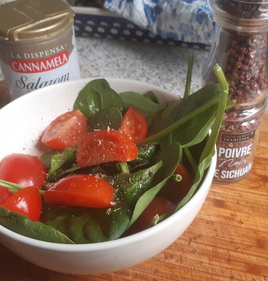 Najprostszą i wciąż oryginalną sporządzimy z młodych liści szpinaku wymieszanych z pokrojonymi pomidorami. Także do tej sałatki pasuje winegret, choć bez musztardy. Zamiast octu możemy wciąż sok z cytryny, zamiast oliwy – któryś delikatny olej.