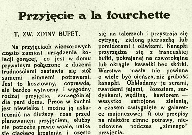Ten dotyczący zimnego bufetu i potraw podawanych do jedzenia a la fourchette pochodzi już z roku 1939. Cały felieton jest piękny i klimatyczny, wyjmuję z niego fragment o tym, jakie potrawy podać, aby gościom łatwo się je jadło. Pani domu organizująca takie przyjęcie skarży się cioci, czyli Pani Elżbiecie, że goście rozgrzebali jedzenie, ale prawie nic nie zjedli. Zostały nieapetyczne resztki prawie całych potraw.