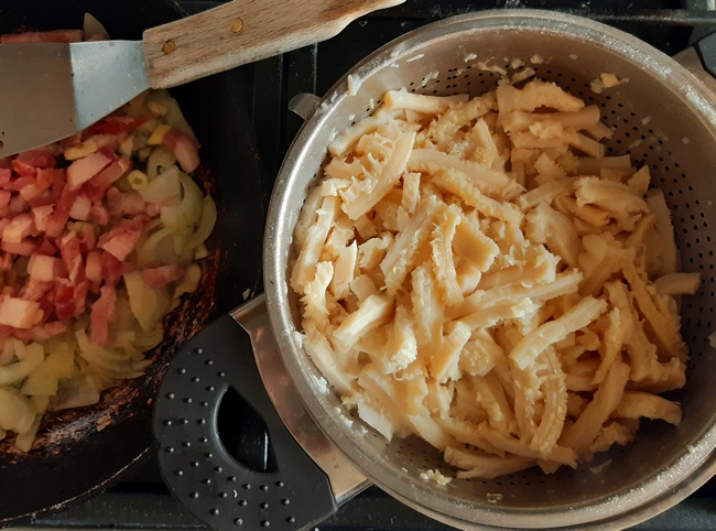 W tym czasie rozgrzać oliwę, dodać łyżkę masła, obsmażyć pokrojony w paski boczek. Gdy się lekko zrumieni, dołożyć pokrojoną cebulę i posiekany czosnek.