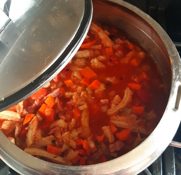 Warzywa dorzucić do flaków, zalać białym winem, obgotować, a gdy wino odparuje, dołożyć pomidory w sosie własnym.