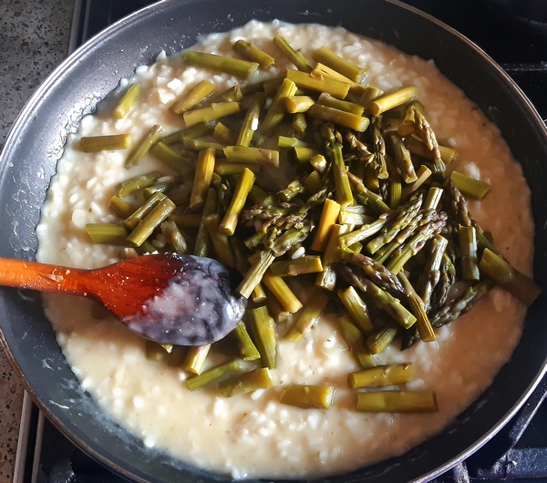 Do ryżu dolewać po trochu bulion, mieszać, pilnować, aby cały czas był pokryty płynem. Dodawać podczas duszenia ryżu po trochu, porcjami, stary ser oraz kawałeczki masła. Potrwa to 15–20 min., zależnie od gatunku ryżu, musi być miękki. W tym czasie w wodzie (osolonej i ew. lekko posłodzonej) lub na parze obgotować pokrojone szparagi (lub fasolkę szparagową). Jeśli są ze słoiczka, tylko zagrzać je w płynie z niego.