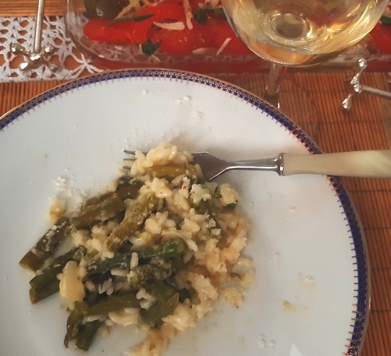 Kto mięsa nie jada, na pewno chętnie zje risotto. Gdy je przyrządzałam, były jeszcze świeże szparagi zielone. Jeśli takich już nie ma, poszukajmy słoiczka z nimi. Będą nawet wygodniejsze, bo nie będzie potrzebne ich wstępne podgotowanie. To ważne zwłaszcza dla tych, którzy w gotowaniu szparagów czują się niepewnie. Szparagi latem można zastąpić fasolką szparagową: zieloną lub żółtą. Tak samo obgotowaną.