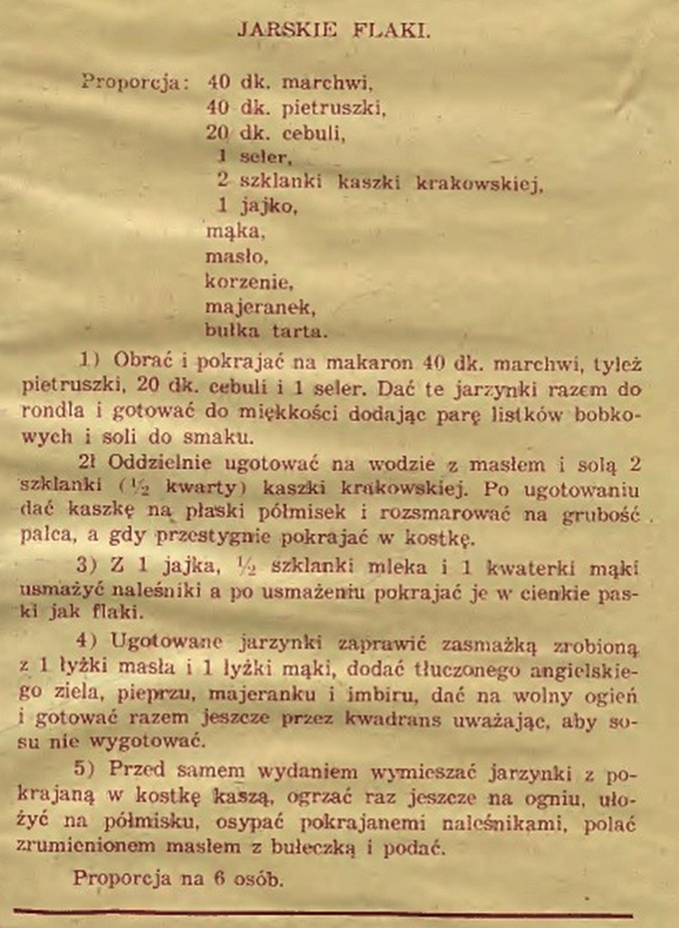 A przepis przedstawił flaczki bez mięsa, czyli jarskie. Te też były w kuchni polskiej popularne, podobnie zresztą, jak wersja rybna: flaczki z lina. Podawano je podczas przestrzeganych skrupulatnie dni postnych.