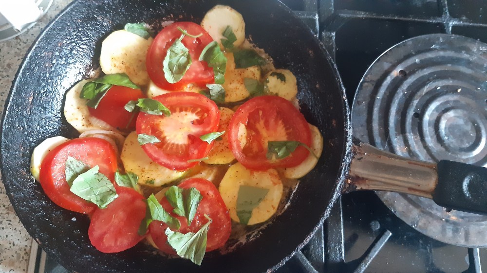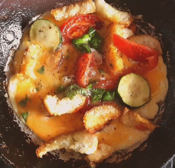 Można także do cukinii z pomidorami dodać grzanki, a wszystko zalać jajkami rozkłóconymi z solą, pieprzem i ziołami. Otrzymamy wtedy treściwy omlet.