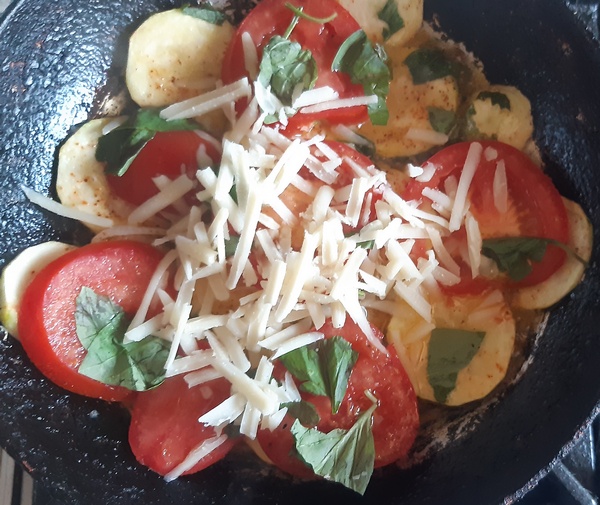 Dusimy przez kilka minut, aby pomidory dobrze się zagrzały. Wtedy posypujemy je startym serem.