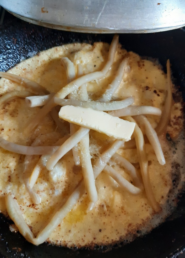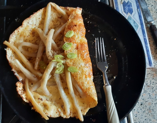Omlet zawsze smakuje z fasolką szparagową. Jeszcze można ją dostać. Gdy podamy ją ugotowaną po polsku (a więc z zasmażoną bułeczką) na obiad, zostawmy porcyjkę na drugi dzień. Usmażmy wtedy omlet, pod koniec dodając do niego tę ugotowaną fasolkę i porcję masła.