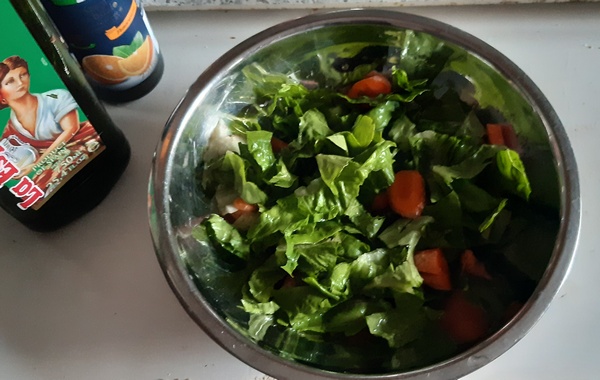 Do tych wszystkich dań czy raczej małych danek zawsze warto podać sałatę. Wymieszajmy ją z pomidorami (tymi małymi lub cząstkami większych) i doprawmy winegretem z oliwy i octu.