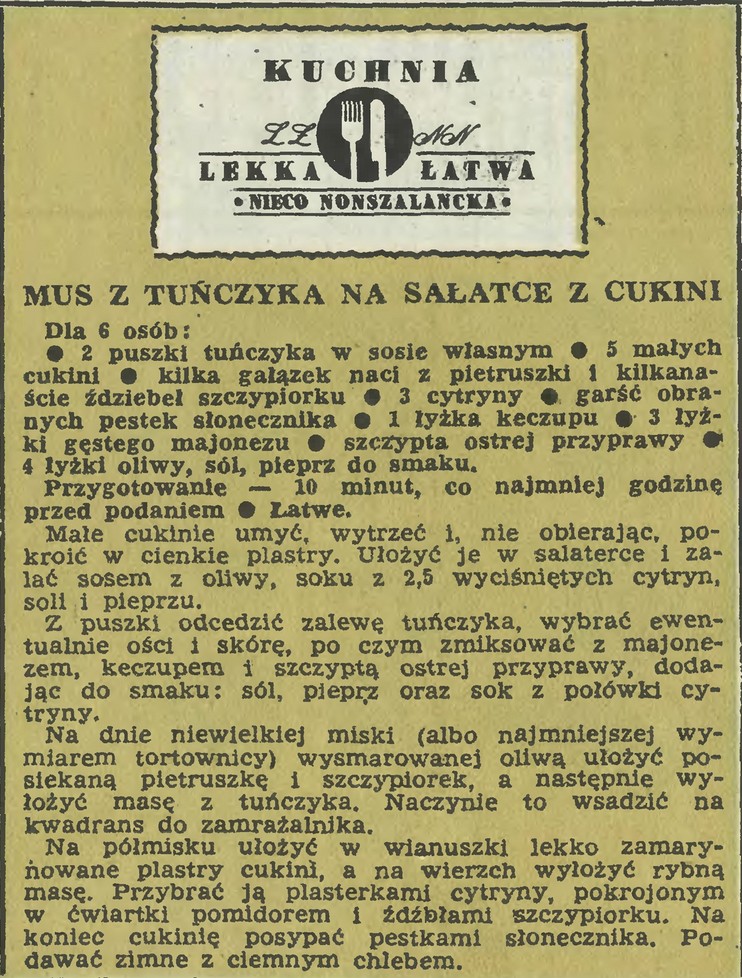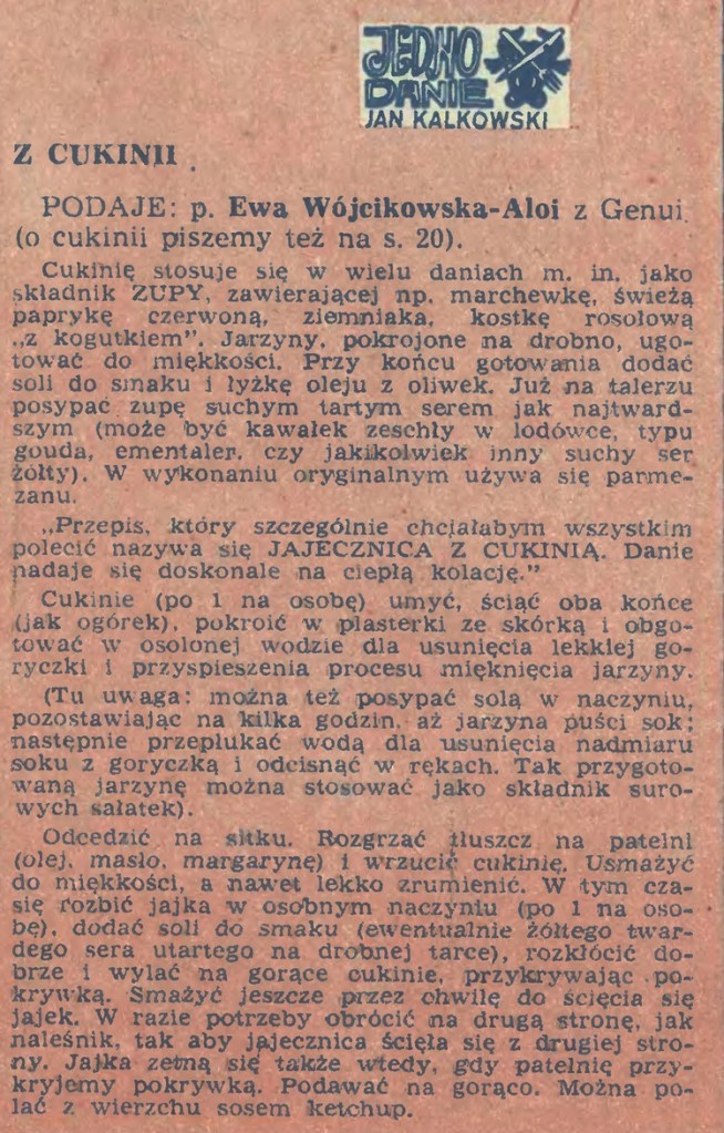 Cukinię przez lata wytrwale popularyzował „Przekrój”. Zwłaszcza chętnie czytane (i wykonywane!) były zawsze propozycje jego czytelników. Pierwsza, oryginalnie z Włoch, z roku 1977.