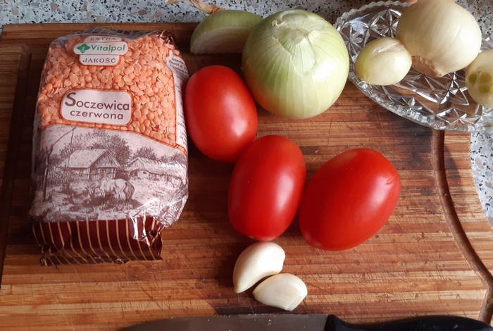 Soczewicę opłukać. Dwie cebule pokroić w plastry, pokroić pomidory (warto je zblanszować i obrać ze skóry), posiekać czosnek.