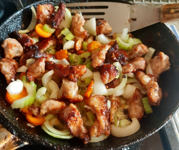 Podobnie można zapiekać mięso z nieco innymi warzywami, łącząc cebulę i pomidory z pokrojoną w paski papryką. Gdy przyprawimy je oryginalną pastą do gulaszu (lub podobną pastą paprykową), otrzymamy rodzaj węgierskiego gulaszu.