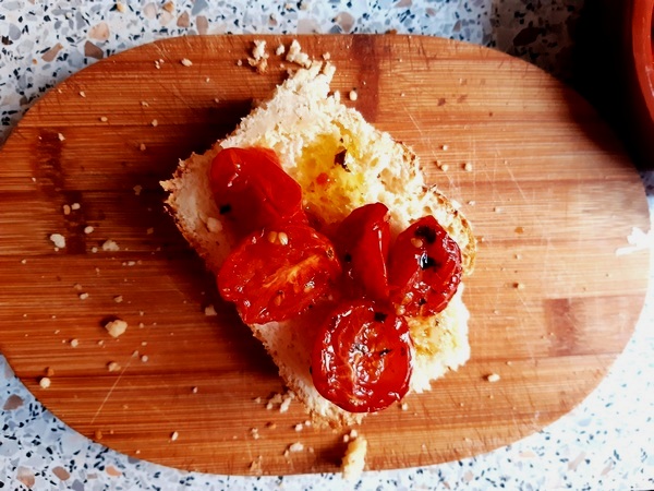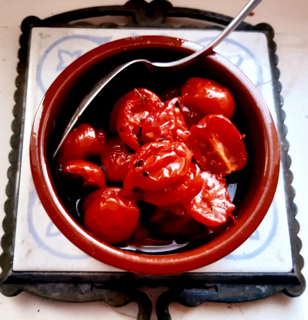Takie konfitowane pomidorki są jak… konfitura (źródłosłów ten sam). Smakują wybornie na chałce lub drożdżowym cieście!