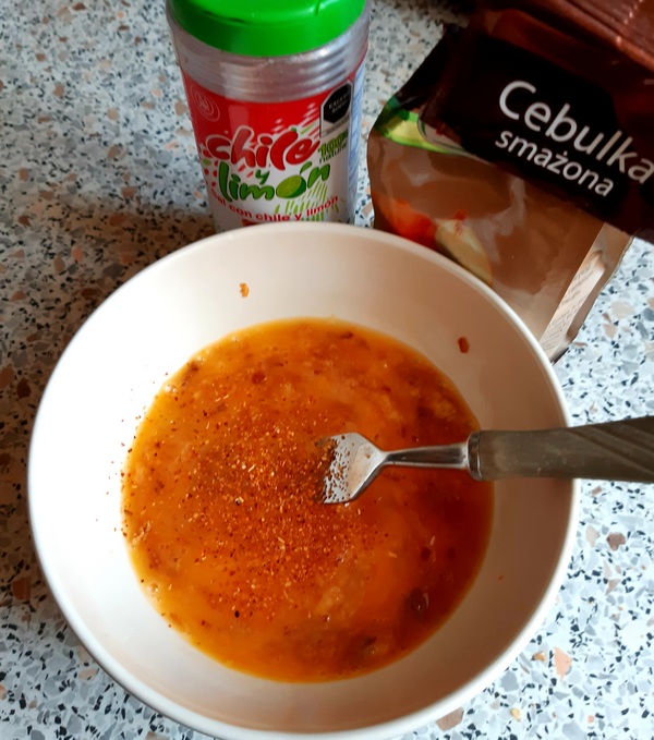W miseczce rozkłócić jajka z przyprawami (osolne, z pokruszonymi chili, ze smażoną cebulką z torebki).