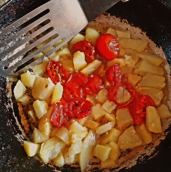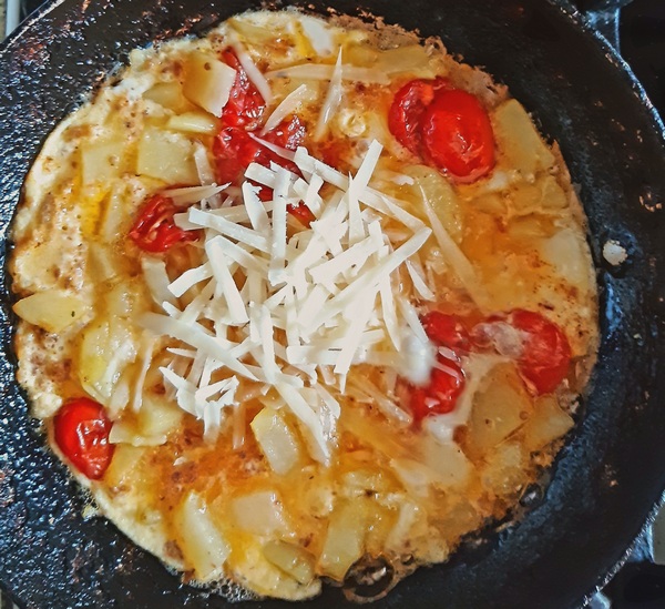 Rozgrzać tłuszcz na patelni, wrzucić pokrojone ziemniaki, a gdy się lekko podsmażą, dodać przekrojone na pól pomidorki. Smażyć mieszając przez 2–3 minuty. Zalać jajkami, na wierzchu rozłożyć starty ser. Przykryć, smażyć omlet na małym ogniu aż jajka się zetną a ser roztopi.
