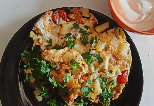 A teraz pomidorki na inny sposób. Jako dodatek do bezpretensjonalnego, domowego, szybkiego omletu do podania na obiad lub kolację. Aha, danko pozwala wykorzystać ugotowane ziemniaki z poprzedniego dnia i zalegający w lodówce podsuszony już ser. Wartościowe resztki.