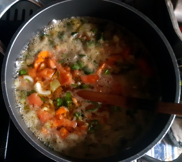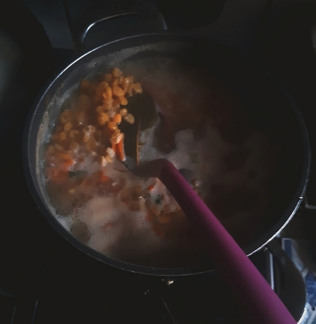 Zupę posolić, popieprzyć. Gotować aż smaki się połączą.