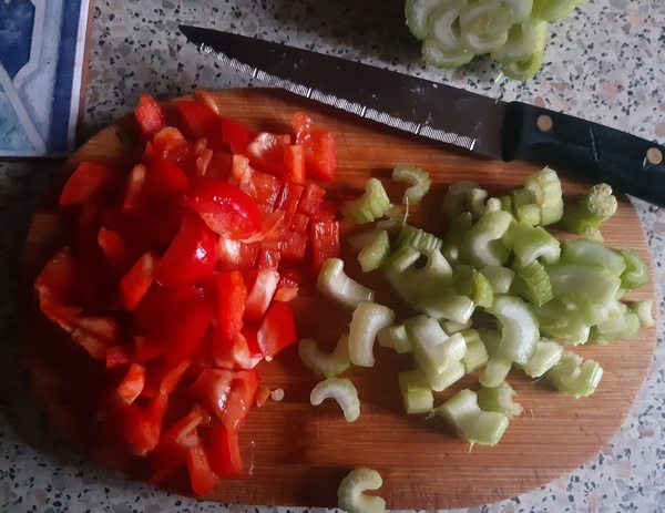 Pomidory bez skórki i oczyszczony z włókien seler pokroić w kostkę, dodać do grochu, gotować 10–15 minut. Posolić, doprawić do smaku i pożądanej ostrości papryką lub pieprzem.
