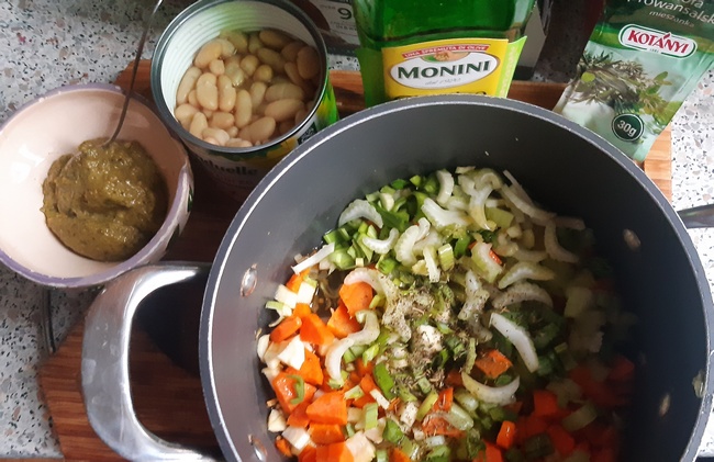 Zalać wodą, dodać opłukaną fasolę z puszki, dodać słoiczek pesto.
