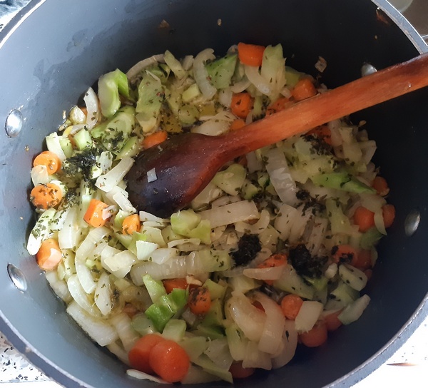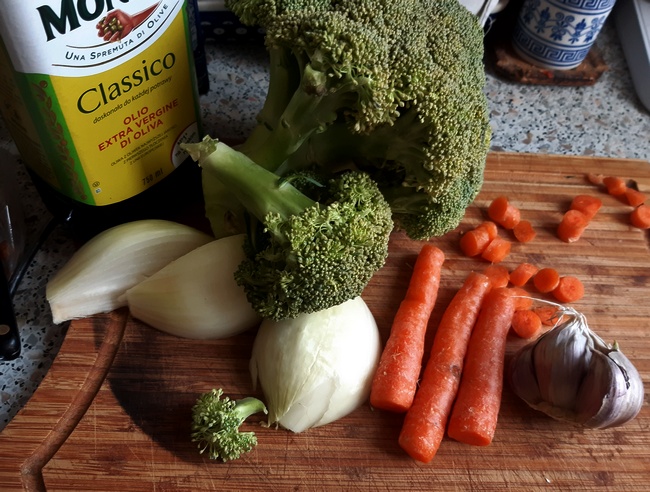 Brokuł podzielić na różyczki. Łodygi odciąć, pokroić w kostkę. Marchew, cebulę, seler naciowy obrać, obmyć, pokroić w kostkę. Poddusić 15–20 minut w oliwie razem z łodygami brokuła, dodając pod koniec posiekane lub roztarte ząbki czosnku i suszony czosnek niedźwiedzi.