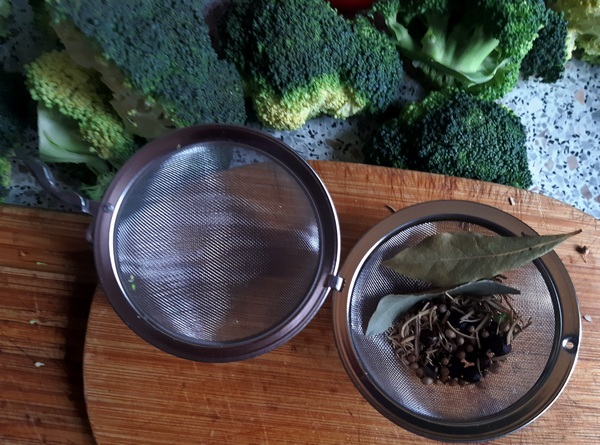 Gotując zupę, smaku przydajemy jej przyprawami; do tradycyjnych należą listki laurowe oraz te korzenne (pieprz, ziele angielskie), ale i ziołowe (kminek, kmin, suszone zioła – majeranek, tymianek itp.). Od przyjaciółki z Francji (Aniu, dziękuję!) dostałam w prezencie bardzo przydatny kuchenny gadżecik do przypraw: zamykane dwuczęściowe sitko, do którego wkładamy te wszystkie ziarenka i nie musimy ich potem mozolnie usuwać po ugotowaniu!